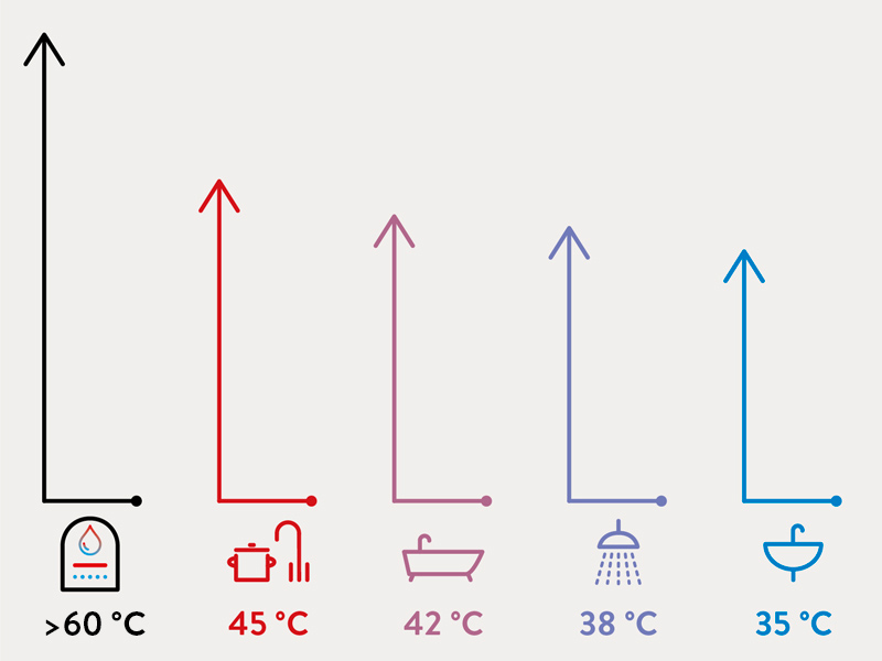 Der Warmwasserbedarf gibt an, wie viel warmes Wasser in einer bestimmten Temperatur für einen Anwendungszweck benötigt werden. Zum Händewaschen werden normalerweise ca. für 10 Sekunden 35 Grad warmes Wasser benötigt. Bei einer Entnahmemenge von 2 L/min ergibt sich dadurch eine Wassermenge von 0,33 Litern.