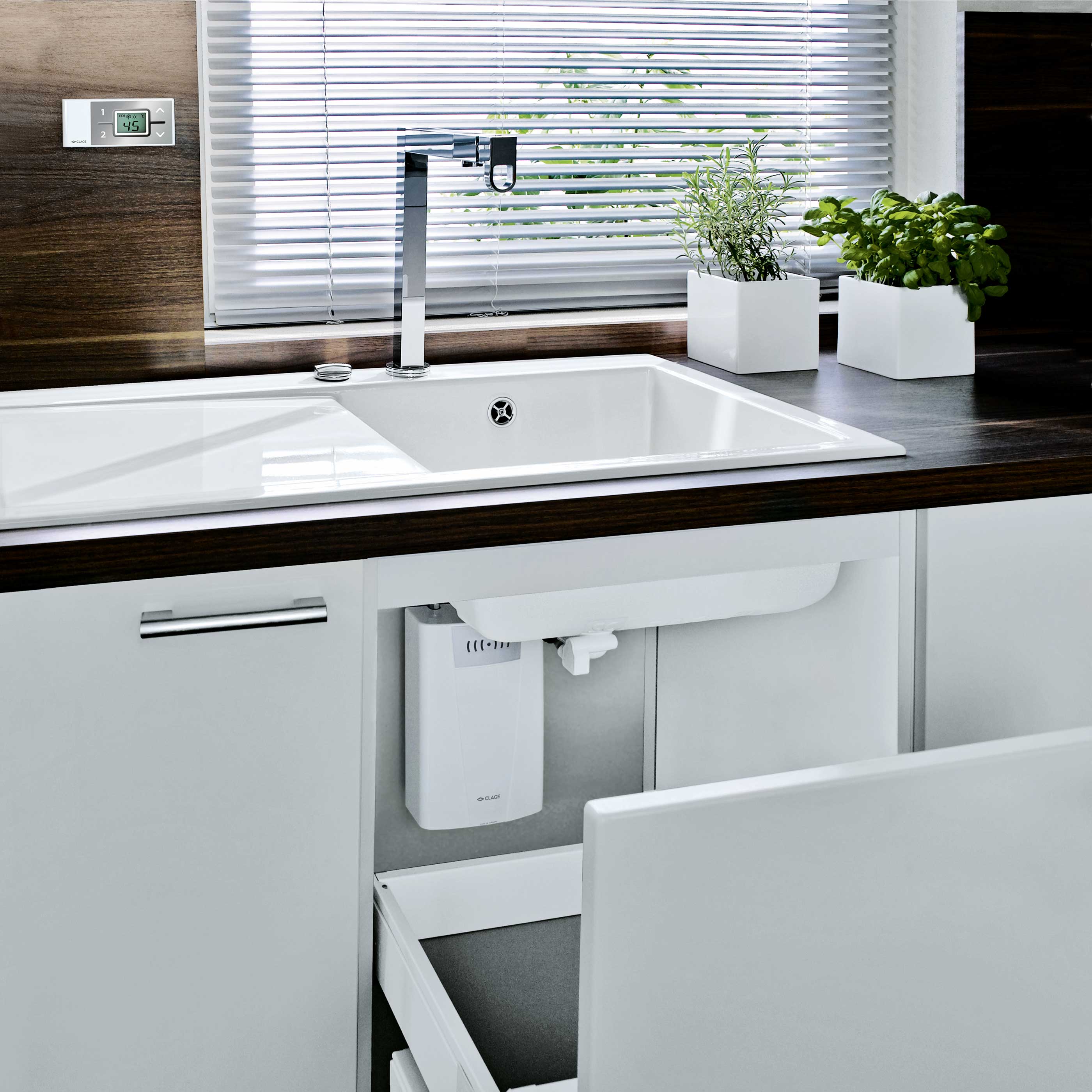 Ein Kompakt-Durchlauferhitzer ist ein Elektro-Warmwassergerät mittlerer Baugröße und Leistung (ca. 11 bis 13,5 kW), das eine zuverlässige und energieeffiziente Warmwasserversorgung für einzelne Zapfstellen ermöglicht. Er erwärmt das Wasser bedarfsgerecht während des Durchströmens und eignet sich mit einer maximalen Durchflussmenge von 5l/min besonders für Küchenspülen und Ausgussbecken.