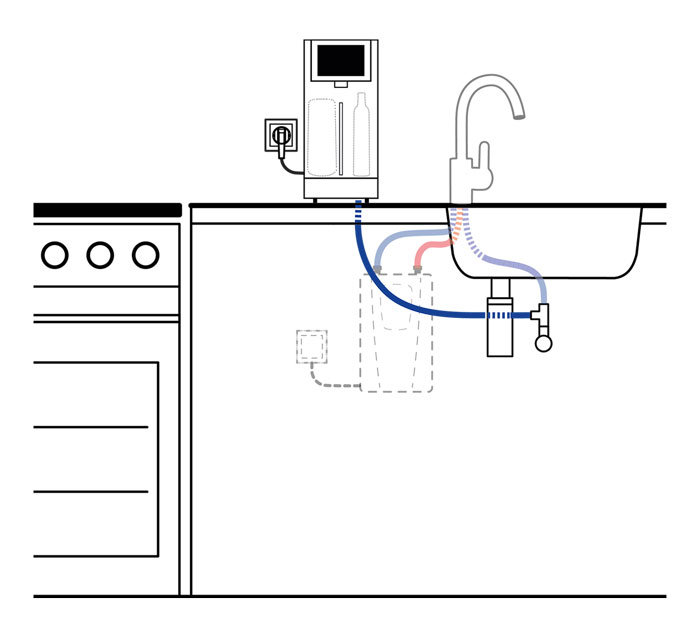 - Elektronisches Wassersystem zur Bereitstellung von gefiltertem Tafelwasser, wahlweise ungekühlt, gekühlt still, medium oder stark sprudelnd für den direkten Anschluss an ein Eckventil