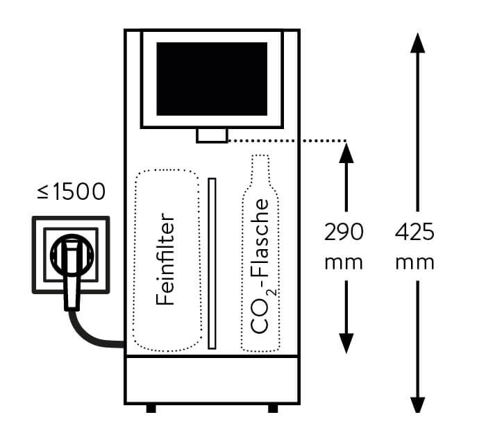 - Bis zu 20 Liter pro Stunde gleichbleibend gekühltes und mit Kohlensäure angereichertes Wasser