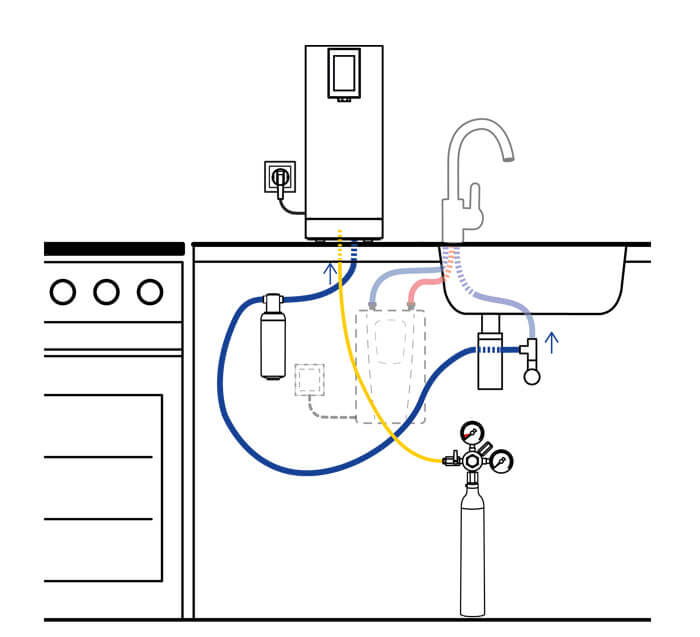 - Elektronisches Wassersystem zur Bereitstellung von gefiltertem Tafelwasser, wahlweise ungekühlt, gekühlt still oder stark spru- delnd für den direkten Anschluss an ein Eckventil