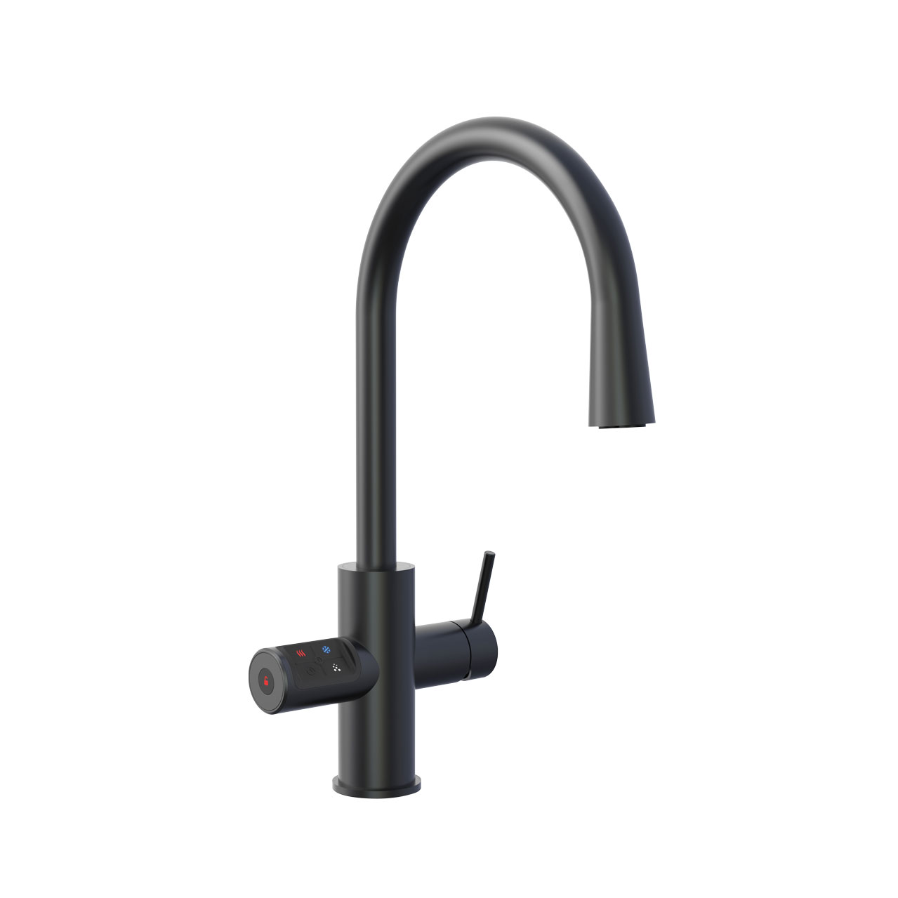 - Twee dispensers: een zijbedieningsknop voor kokend, gekoeld of bruisend water en een ééngreeps mengkraan voor het aftappen van normaal kraanwater (uit de centrale of decentrale warmwatervoorziening)